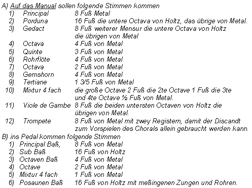 Am 22. Juli 1780 gaben Hansen und Bürgermeister Sprengel einen Orgelbauvertrag zu Protokoll, der folgende Dispositon zu Protokoll (Auszug):