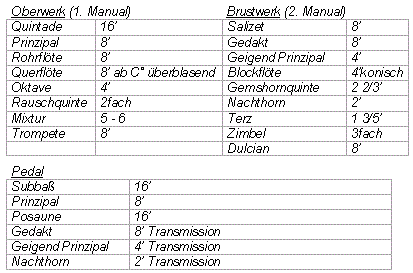 Im Jahre errichtete die Firma Faber & Dienes GmbH aus Salzhemmendorf eine pneumatische Orgel (mit Druckknöpfen, Crescendowalze usw.) im Wesentlichen nach der Mahrenholzschen Disposition.