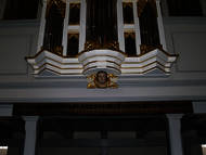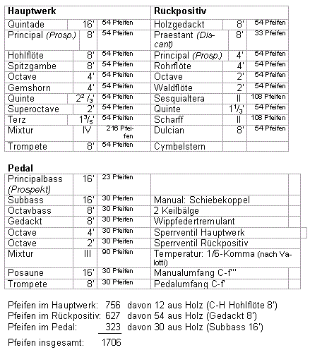 Die Disposition mit 30 Registern verteilt auf Hauptwerk, Rückpositiv und Pedal ist ebenfalls ganz klassisch und passend zum Raum und Werk angelegt. Im Prospekt stehen die hochprozentigen Zinnpfeifen der Register Principal 8’ (Hauptwerk), Principal 4’ (Rückpositiv), und Principal 16’ (Pedal).