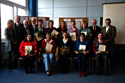 Zum Schluss der Veranstaltung erhielten die beteiligten Erzieherinnen aus den Händen von Landrat Wickmann und Projektleiter Dr. Ropeter die KiSINGa-Projektzertifikate. Darin werden das Anforderungsprofil, die Projektinhalte und die nachgewiesenen Leistungen der Erzieherinnen ausgewiesen.