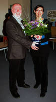Sie bedankten sich für die gute Betreuung in diesem Projekt bei der Leiterin der Weiterbildung, Diplom-Musikpädagogin Svetlana Smertin, mit einem prächtigen Blumenstrauß in einer eigens angefertigte Fredelsloher Blumenvase und beim Projektleiter Dr. Ropeter mit einem Herrentrunk.