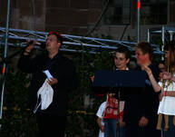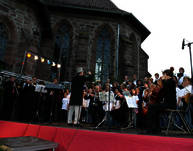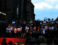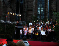 Kinderchor, Kantorei, Bläser und Streicher auf der Bühne in Aktion.