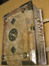 Einband: Holzdeckel mit weißem gepresstem Leder überzogen, mit Ecken, Buckeln, Rosetten und Schliessen von Messing, dazu Blattzeiger und Lesezeichen von Leder