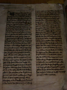 Wir, Hermann von Echte, Hans von Hevenshusen (Anm.: Hevensen) der Ältere, Älterleute und Vorsteher des Gebäudes der Kirche St. Johannis zu Göttingen, bekennen öffentlich in diesem Brief für uns und unsere Nachkommen, dass wir in diesem Brief verkauft haben und verkaufen fünf ewige Ferding Geldes Göttinger Währung für dreißig Mark derselben Währung, die uns Hans von Waake der Ältere richtig bezahlt hat und die wir zum Nutzen unseres Gotteshauses ausersehen und verwandt haben und damit besonders ein Messbuch und einen Kelch gekauft haben von dem Priester Herrn Werner von Hardegsen. Und diese vorgenannten fünf Ferding versprechen und geloben wir für uns und unsere Nachkommen alle Jahre auszugeben für ein ewiges Vermächtnis und Seelengerät, wie es der vorgenannte Hans von Waake der Ältere in unserem Gotteshaus getan hat viermal im Jahr, jedesmal einen Ferding, wie es im folgenden beschrieben ist: zunächst am Tag des heiligen Bartholomäus, am Tag des heiligen Clemens, am Tag des heiligen Petrus, der da heißt Petri Kettenfeier, und am Tag des heiligen Urbanus. Jedes Mal sollen und wollen wir am Abend der Vigil (Anm.: Feier am Vorabend des Festtags) dem Pfarrer einen Schilling geben, zwei seiner Kapläne jedem neun Pfennige, zwei Altaristen in der Kapelle St. Antonius in der Kirche daselbst zu St. Johannis jedem neun Pfennige; zwei Altaristen die zu der Kapelle St. Thomas gehören, die in der Kirche St. Jakobi bei dem Turmpfeiler gelegen ist, jedem Altaristen, der zu der Vigil kommt, neun Pfennige, zwei Älterleuten (Anm.: Kirchenvorstehern) von St. Johannis, jedem Ältermann neun Pfennige, dafür dass sie im Sinne des genannten Vermächtnisses Andacht halten; Schülern: jedem Schüler zwei Pfennige; den Küstern: dem großen vier Pfennige, seinem Schüler zwei Pfennige. Und zu diesen vier Tagen sollen wir zwei Pfund Wachs kaufen und sollen davon vier Lichter (Anm.: Kerzen) machen lassen für die Vigil und [sie sollen] zu der Seelenmesse angezündet werden und die [Seelenmesse] soll man halten in der Kapelle von St. Johannis. Und die Lichter soll man dann auf den Engel (Anm.: Leuchterfigur) in der vorgenannten Kapelle St. Antonius setzen. Und was hiervon übrigbleibt, das sollen und wollen wir stiften zu den zwei Seelenmessen. All diese im Vorangehenden beschriebenen Stücke und Artikel versprechen und geloben wir für uns und unsere Nachkommen stetig und ganz zu halten ohne Arglist und Gefährdung und geben dazu diesen Brief gesiegelt mit dem Siegel unserer Kirche nach Gottes unseres Herrn Geburt vierzehnhundert Jahre am Tag des heiligen Urbanus, des heiligen Papstes und Märtyrers.